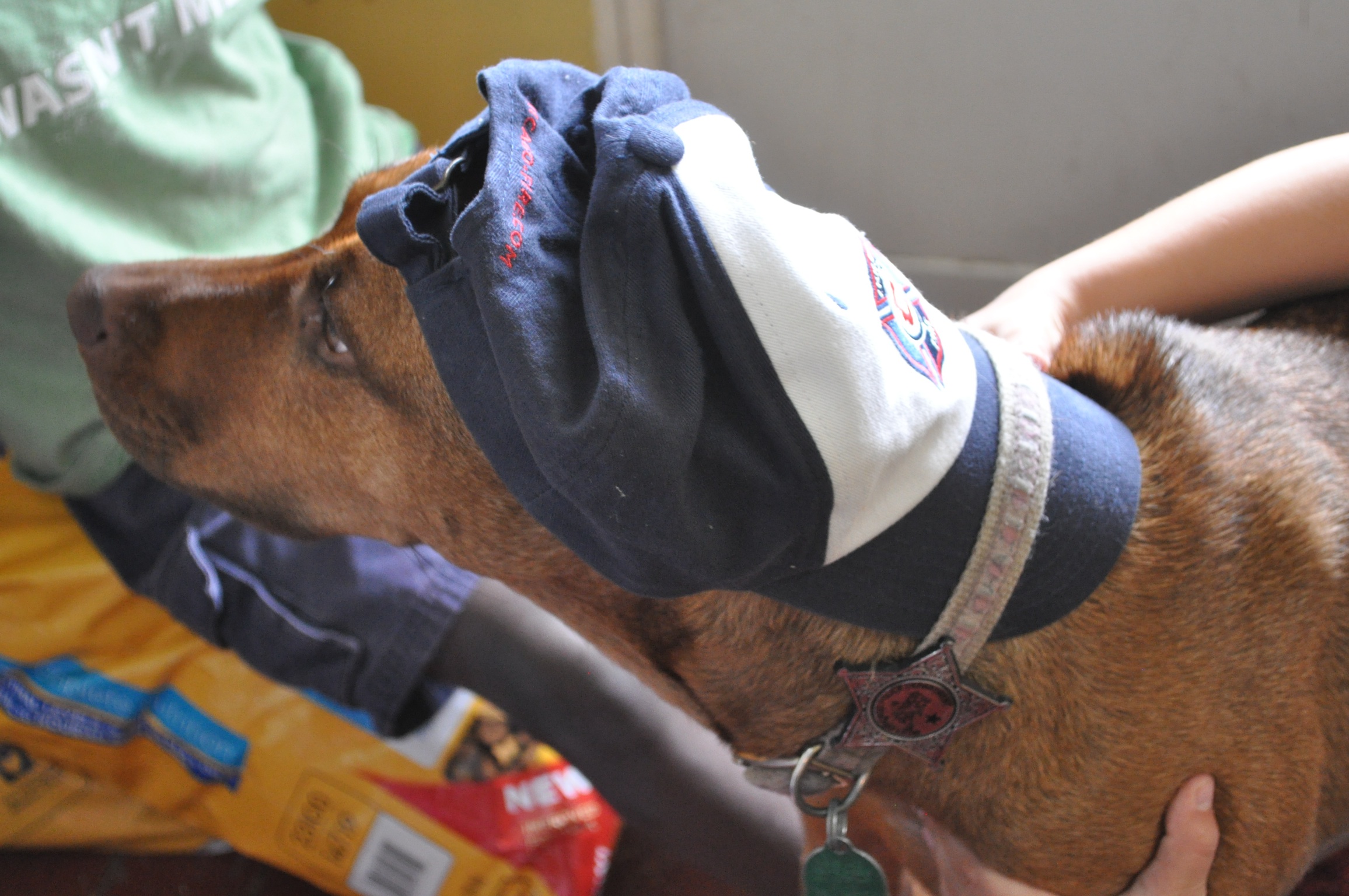 Chai has to put up with a lot. This day she was dressed as a sheriff--notice the badge on the collar.