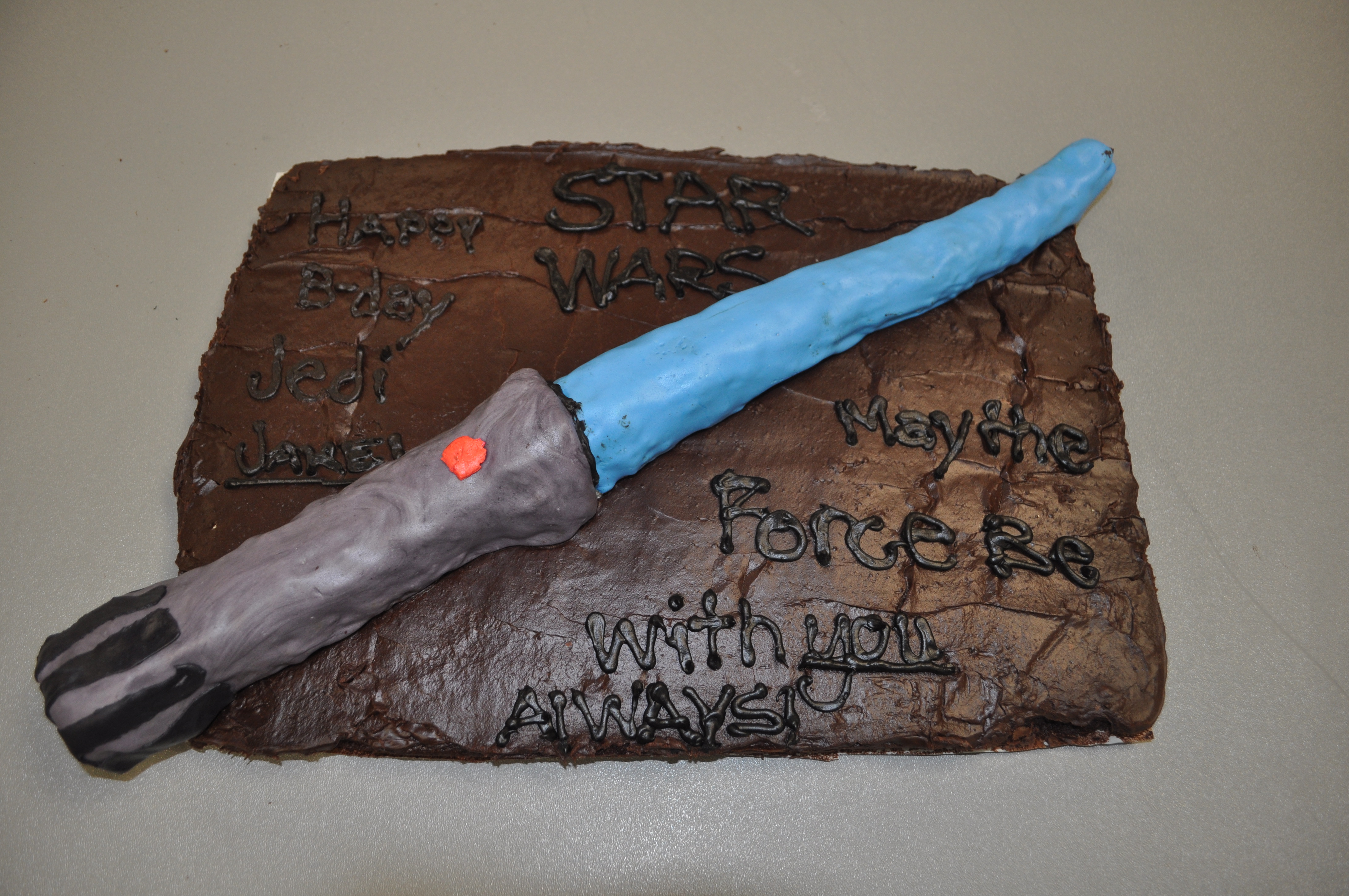 Birthday weekend is over! Whew! Chef Em (with me acting as her assistant) created her second cake in two days. This one is Jake's. I couldn't get the black writing on brown frosting to be bright enough in my camera lens, so here is what it said: Happy Birthday, Jedi Jake. Star Wars." The light saber is rice crispy treat covered in frosting and then in marshmallow fondant.