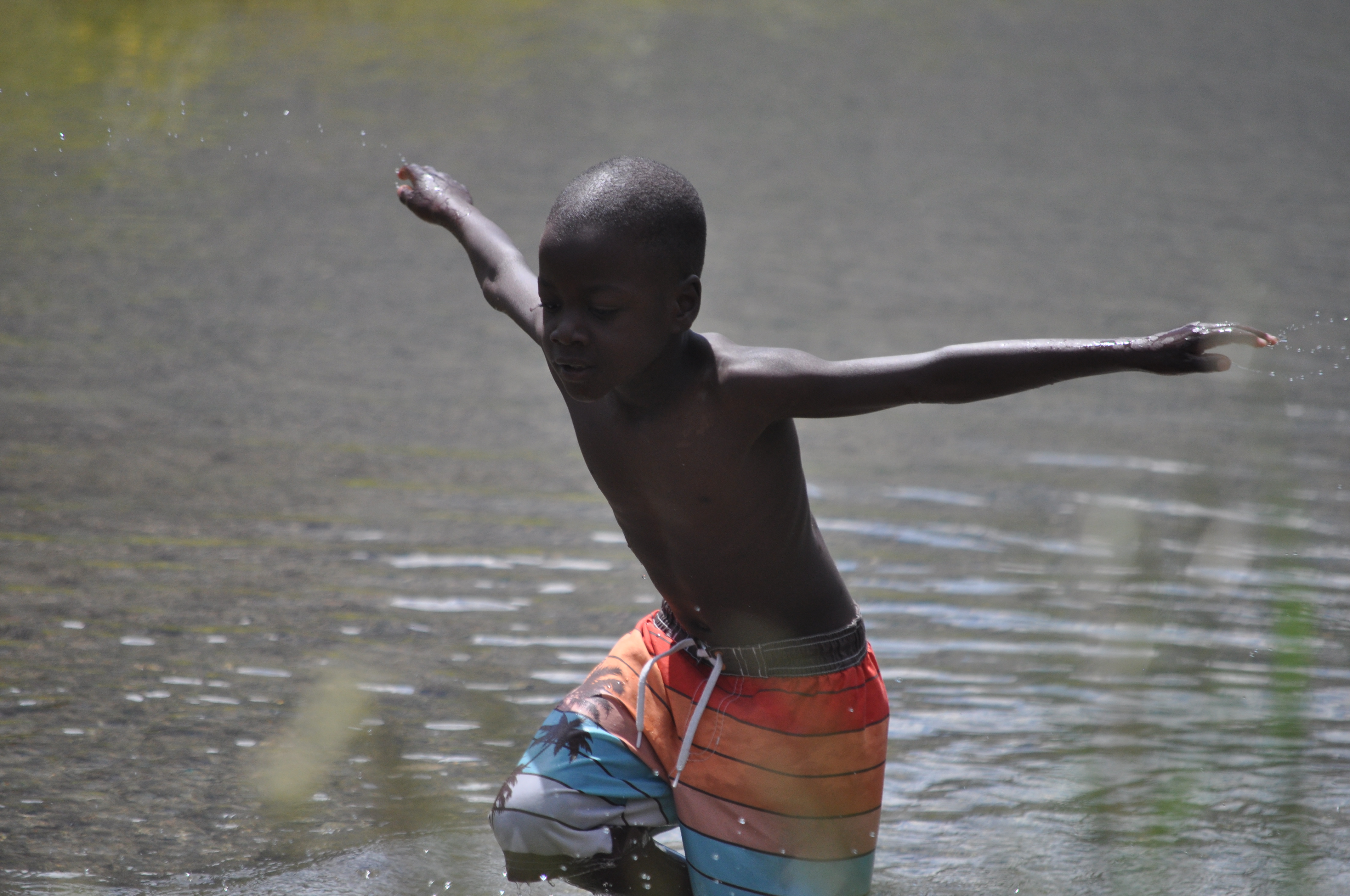 This is PJ jumping in an ice-cold, snow-melt lake in Montana, where we vacationed a couple weeks ago. Seriously, my ankles HURT after standing in the water just a few seconds, and my crazy guy literally jumped in it–and then huddled on the sun-warm pebbles shaking from the cold just a few minutes later.