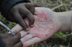 I took this picture in Kenya last year. A small child was fascinated with Emily's white skin and wanted to write on her hand. She was happy to let him.