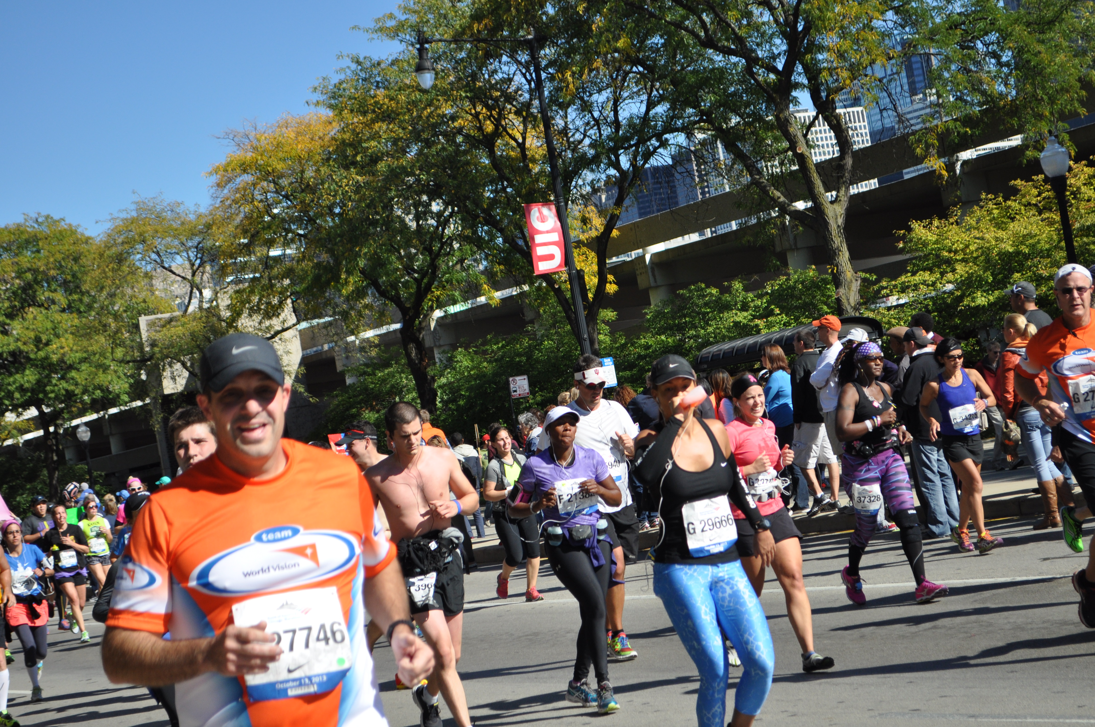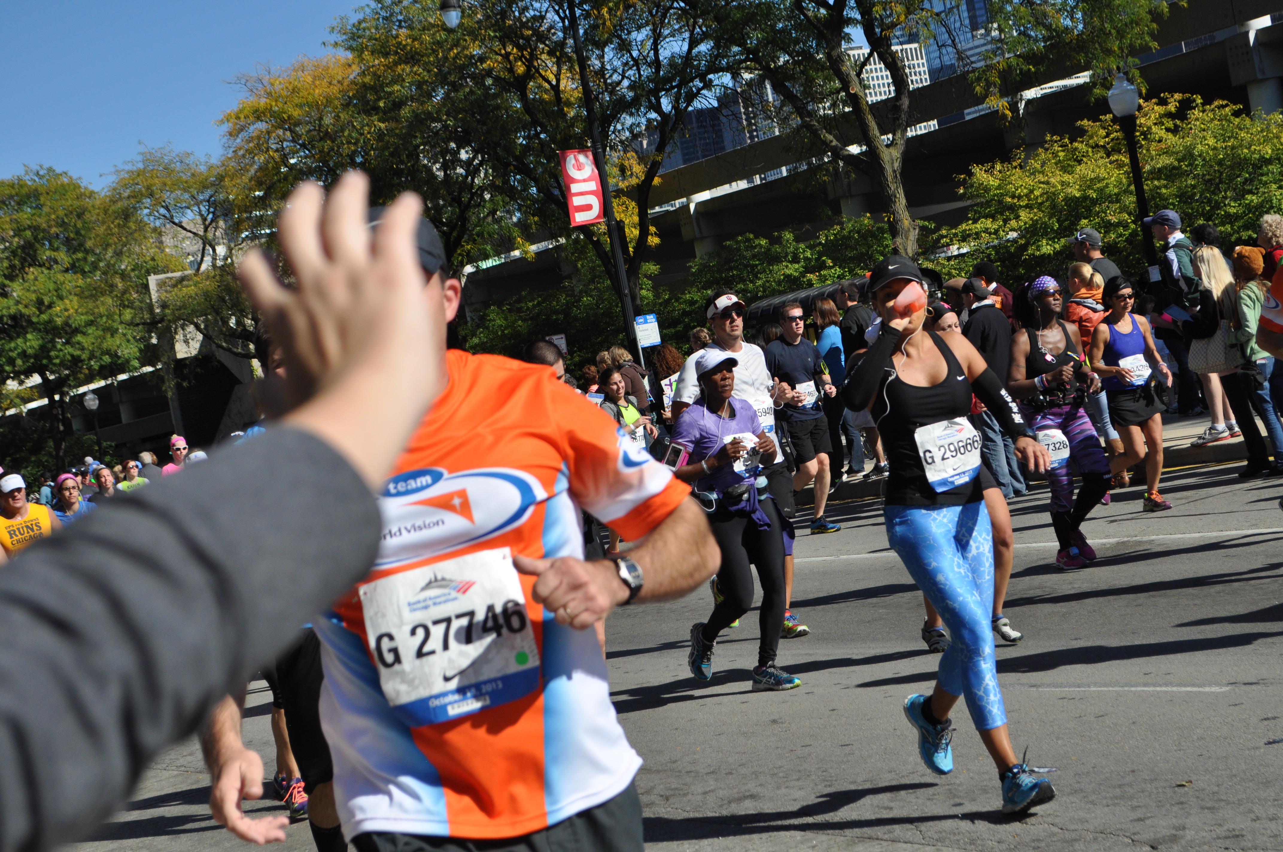 The kids and I, along with some friends, took the blue line down to mile 17 on the course and camped out at the spot where I’d told Dave we would be. We were ahead of schedule, but that didn’t keep us from scanning the crowd for his orange-and-white World Vision jersey. We cheered for every other World Vision runner we saw as well as those who ran for Ronald McDonald and A Cure for Cancer and Leukemia and Autism Awareness and…