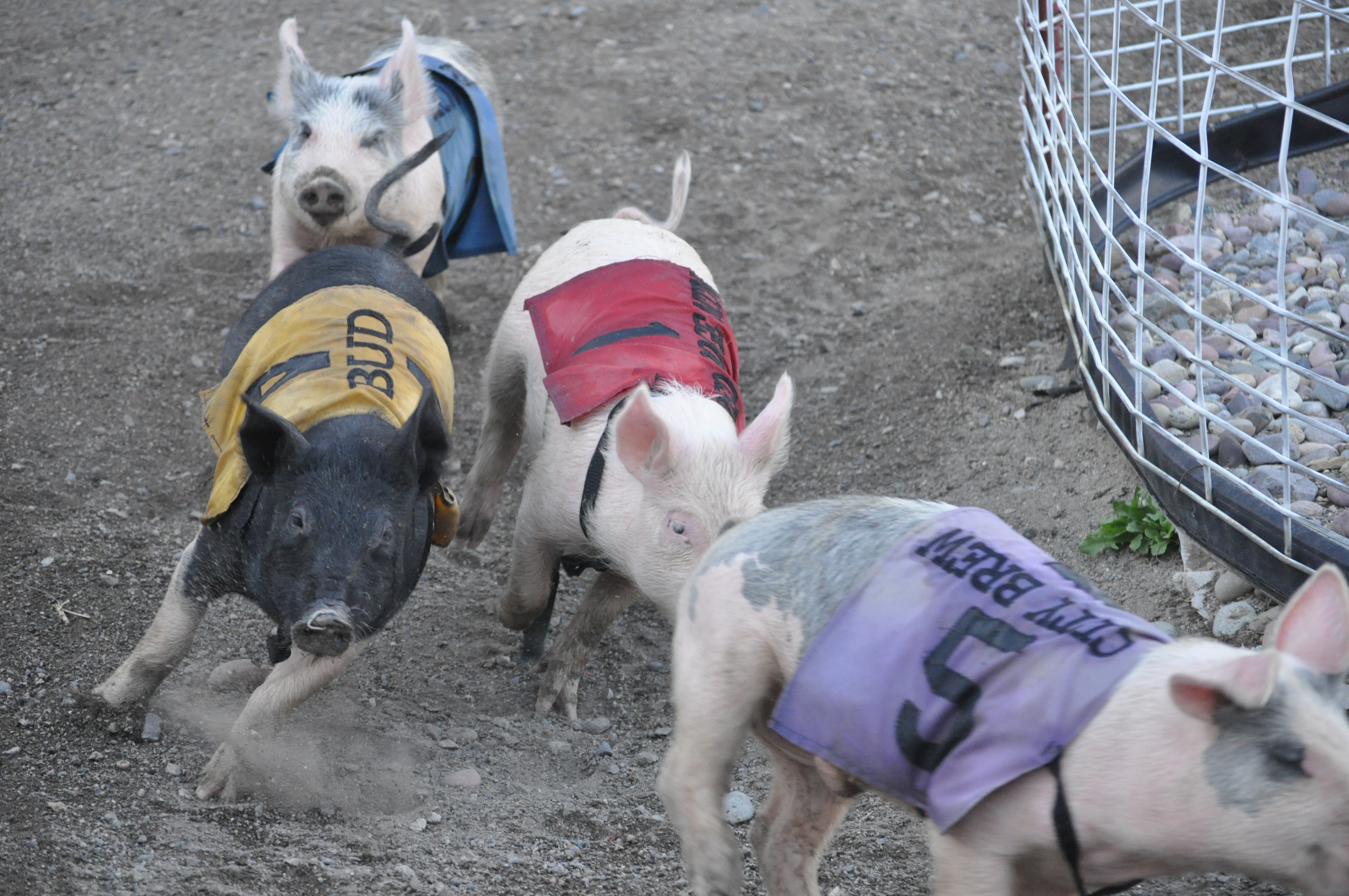 Yes, those are pigs racing. On my birthday, we went to hamburger joint in a tiny town near Red Lodge, Montana (we were on vacation there), that had pig races, one every fifteen minutes starting at 7 p.m. The kids absolutely loved it! I rooted for every little black pig, but not a one of them ever one. I think black pigs are CUTE!